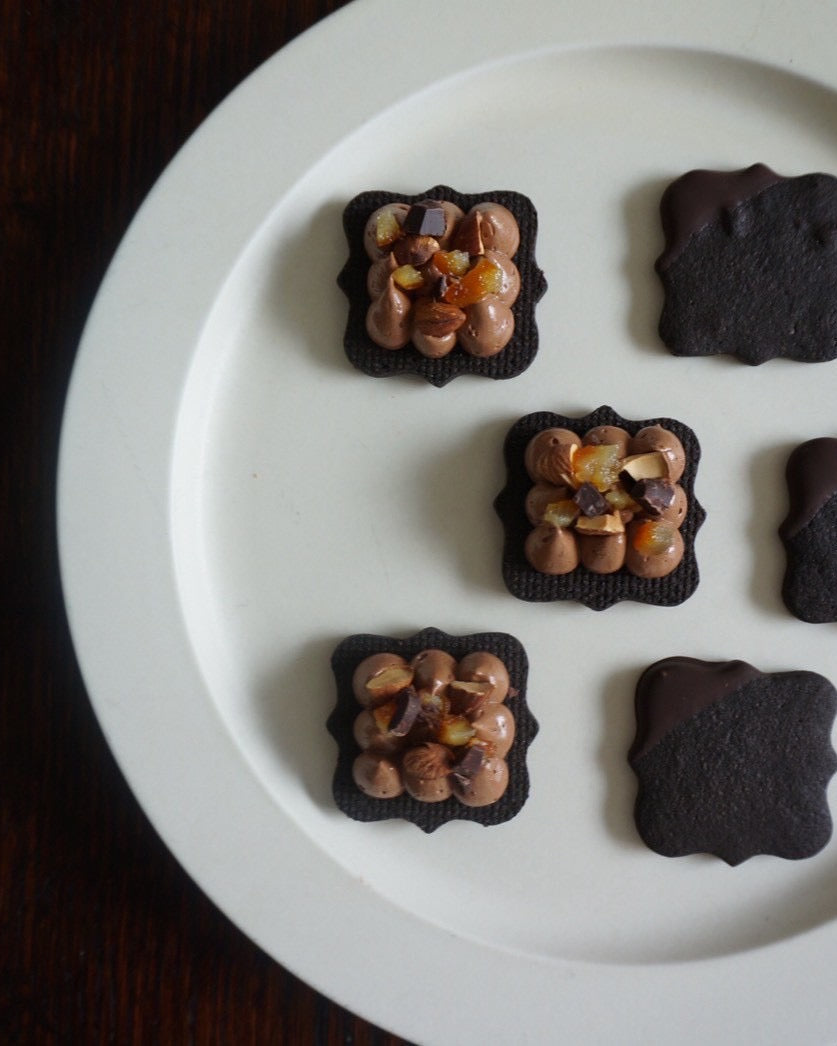 香り高いクーベルチュールを使用したバタークリームにオレンジピールと香ばしいナッツを加え、塩麹の塩味がアクセントになっています。